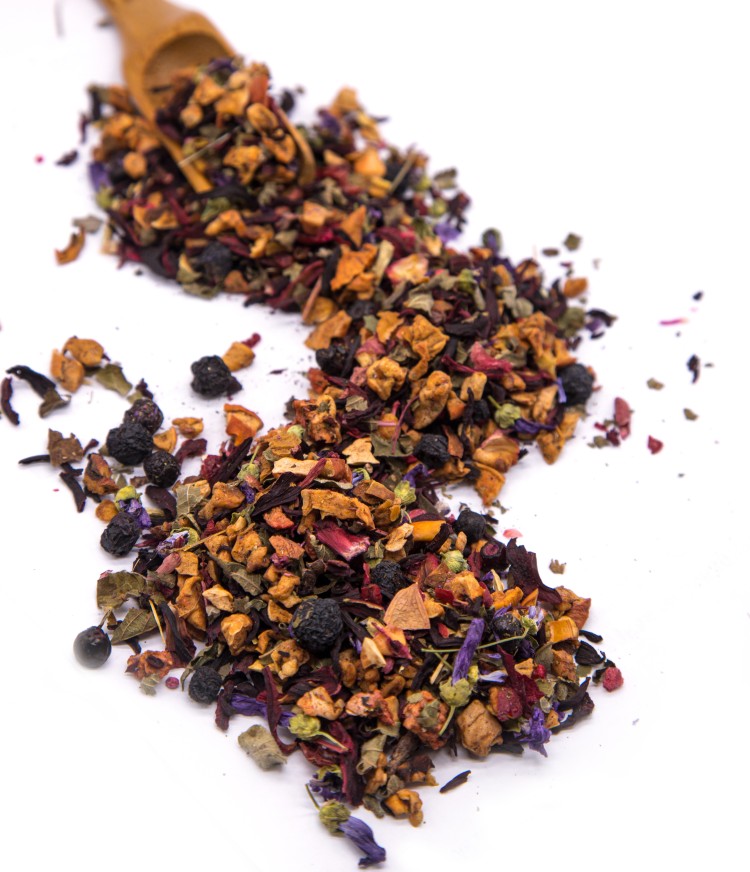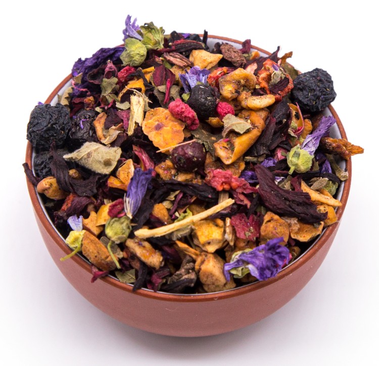 Сочетание каркаде, кусочков яблок, листьев ежевики, плодов аронии, листа грецкого ореха, цветов мальвы,ягод черники, кусочков клюквы, малины, клубники и нежного аромата малины и черники.